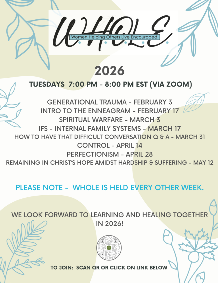 Women Helping Others live Encouraged was created to have a weekly, virtual option to emotional, relational and Spiritual health for our community. This is a one hour training on specific topics to our mental health from a Biblical perspective. ALL ARE WELCOME!!